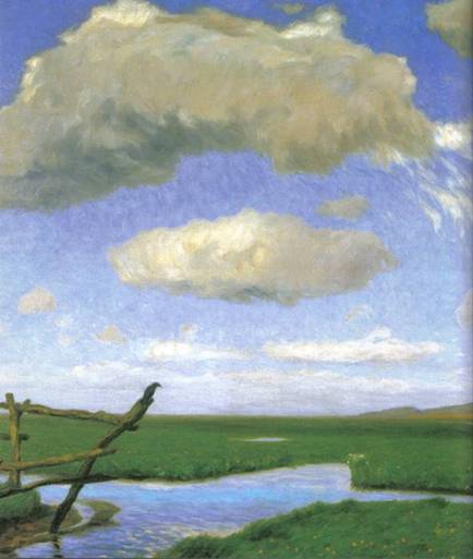 flaches Land mit Birkenalleen, alten Bauernhäusern,Rosenbüschen und Vogelbeerbäumen. Der Boden teilt sich zwischen roter Erikaheide, die wunderbar duftet, und dem seltsam von Kanälen durchschnittenen Moorland. Worpswede ist berühmt durch die Farbigkeit seiner Luftstimmungen und der Pracht der Wolken.